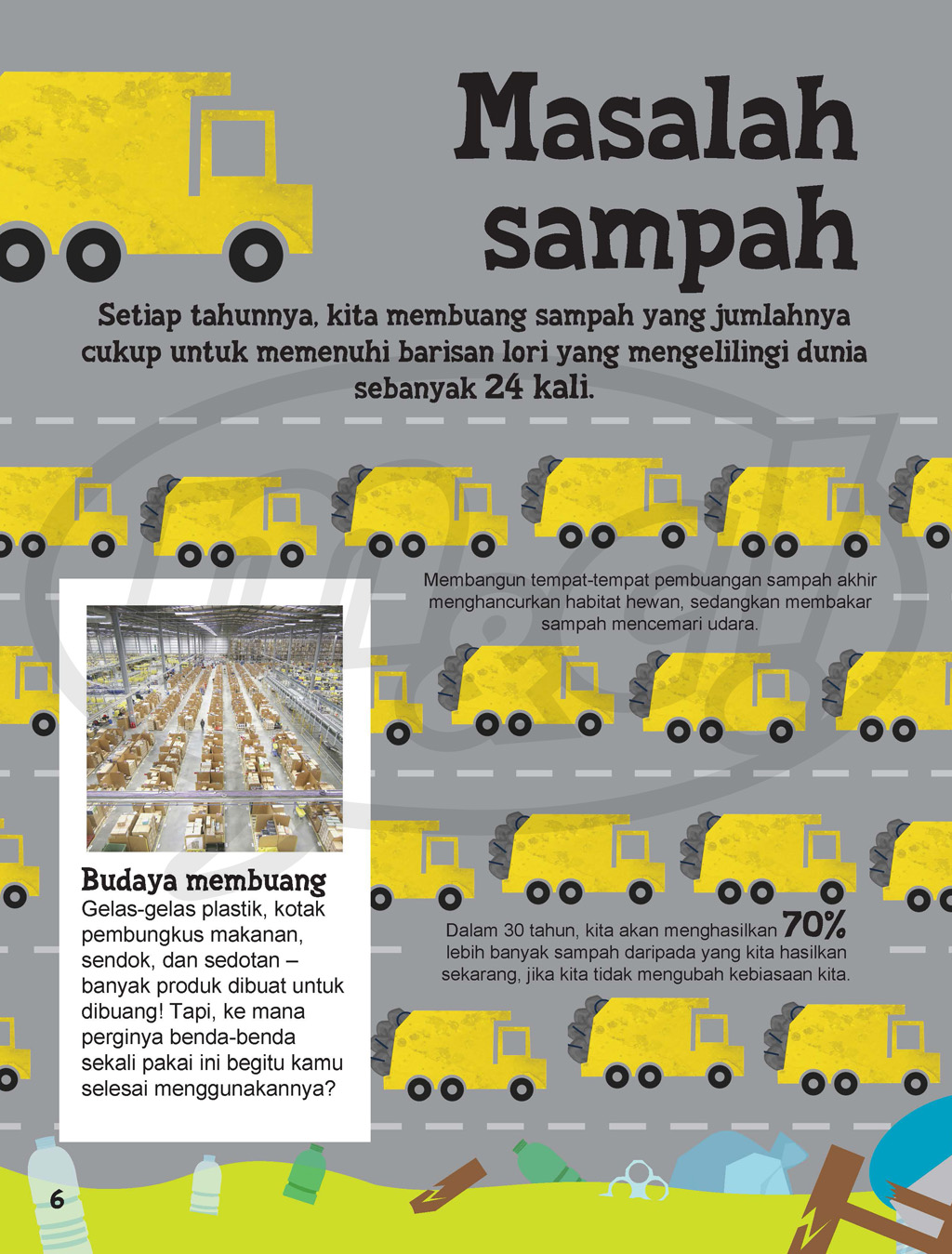 Jess French adalah pecinta lingkungan yang peduli tentang melindungi lingkungan. Saat ia tidak sedang menolong hewan sebagai seorang dokter hewan, ia biasanya sibuk menulis berbagai buku yang mempengaruhi hewan di alam, seperti sampah plastik. Pekerjaannya di TV salah salah satunya adalah membawakan acara anak berjudul Minibeast Adventure with Jess. Hampir semua yang kita lakukan menghasilkan sampah berbagai macam. Dari sampah biasa dan sisa-sisa, sampai ke gas buangan pabrik dan alat elektronik usang. Ayo cari tahu ke mana sampah-sampah itu pergi, bagaimana mereka mempengaruhi planet kita, dan apa yang sedang dilakukan untuk mengurangi masalah ini. Buku ini penuh dengan ide-ide keren bagaimana kamu bisa terlibat untuk membuat planet ini menjadi lebih layak untuk ditinggali. Ternyata, perubahan paling kecil dan sederhana pun bisa membuat perbedaan yang berarti! Ayo, selamatkan Bumi!