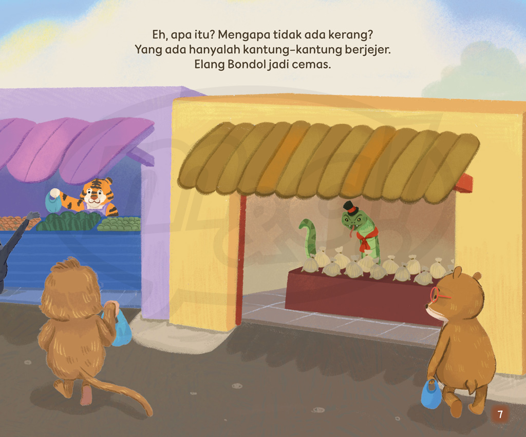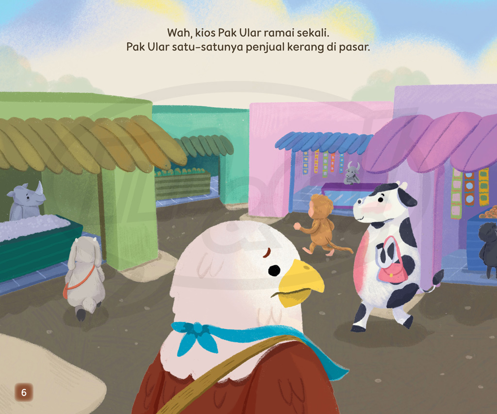 Elang Bondol heran saat tiba di pasar. Pak Ular biasanya menjual kerang,