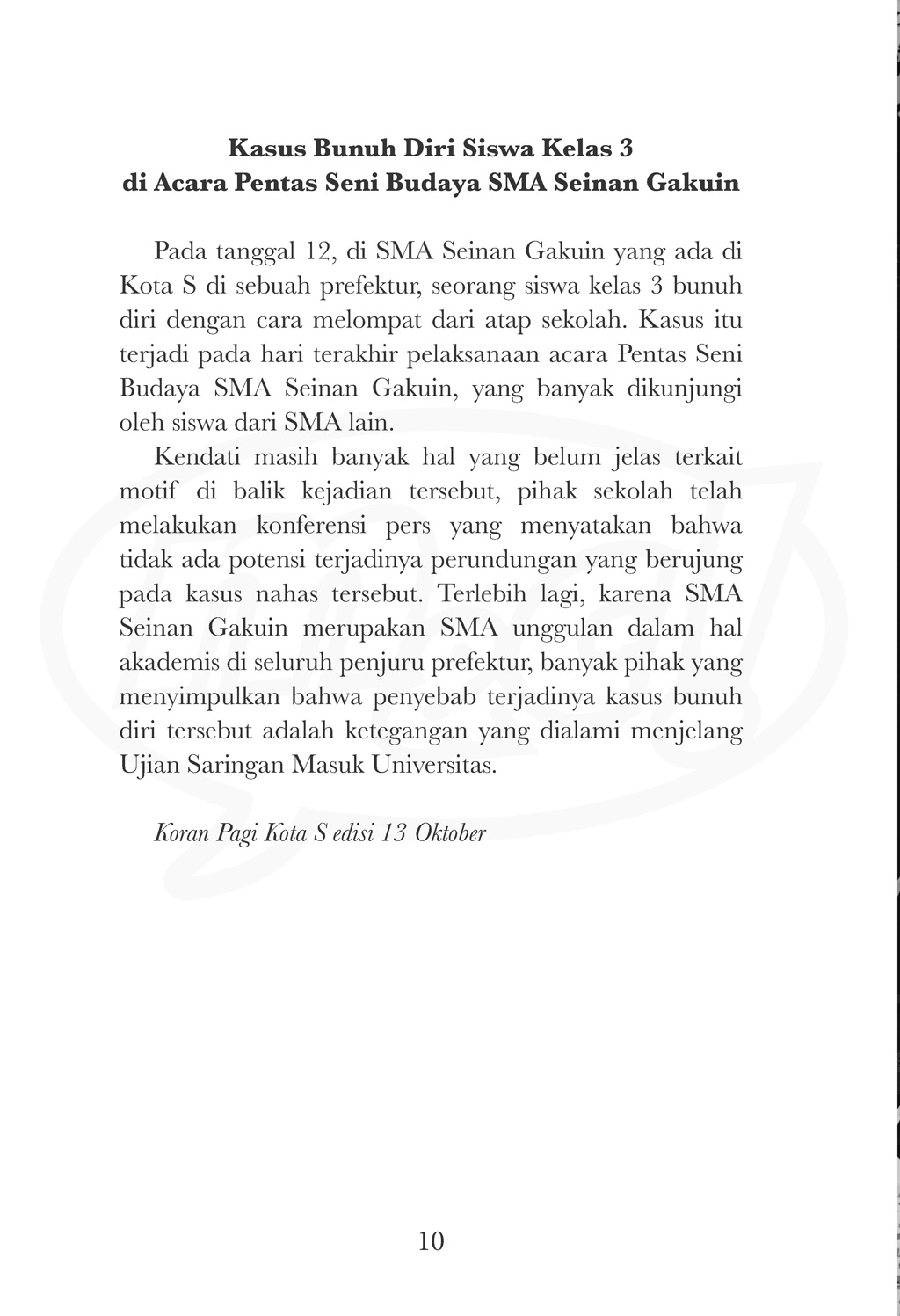 Pukul 05.53. Semua jam yang ada di sekolah tiba-tiba berhenti pada waktu tersebut. Waktu yang sangat spesifik. Waktu ketika seorang siswa SMA Seinan Gakuin bunuh diri dengan melompat dari gedung sekolah pada hari pentas seni budaya. Mereka semua pun sadar bahwa untuk bisa keluar dari sana, mereka harus mengingat kembali apa yang terjadi kala itu. Namun, seperti sebuah fenomena mistis, tak seorang pun di antara mereka mengingat siapa orang yang melompat dari gedung sekolah. Termasuk fakta bahwa orang tersebut mungkin ada di antara mereka.