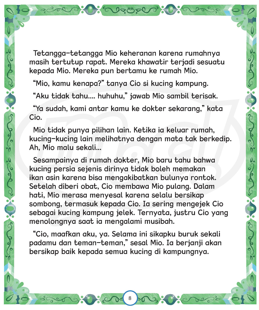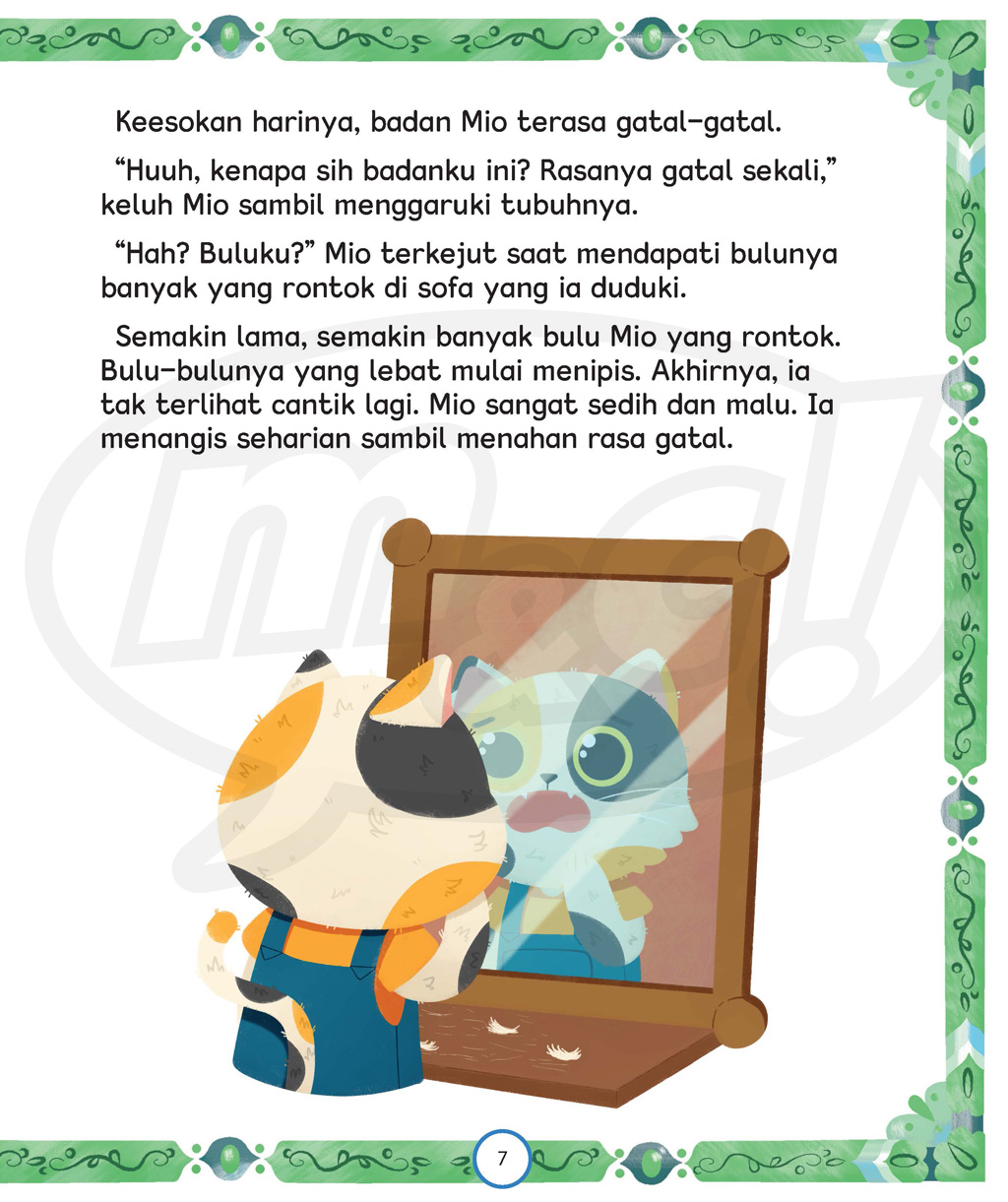 Ia merasa dirinya adalah kucing paling cantik di perkampungan kucing. Mio menjadi sombong! Namun, suatu hari bulunya Mio mengalami kerontokan, sehingga tak indah lagi. Apakah Mio tetap menjadi kucing yang sombong?